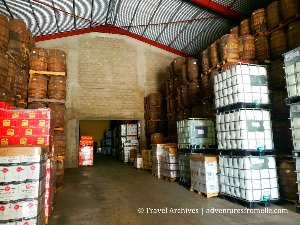 After the video, we were taken outside to watch– & participate in– the sugarcane juice extraction process. Next, guests were treated to refreshing glasses of cane juice then escorted to the distillery in a tractor-drawn jitney. I’m very happy to see this addition to the tour, as back in 2021 we actually had to make our way to the distillery and back in our personal vehicles! Well done, Worthy Park, for listening to guest feedback! When we alighted at the distillery, our tour guide pointed out Blue Mahoe trees, the National Tree of Jamaica. They’re rather tall and statuesque. Afterwards we got to enter the distillery and see where the funky steps of fermentation and distillation occur, then were shown where the magic occurs at the ageing house.