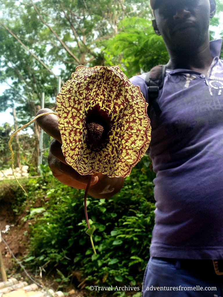 A lovely feature of this river is the limestone found along its banks. The raft captains use it to deliver a delightful foot and leg scrub + massage to their customers, and Andrew didn’t disappoint. My legs and feet felt silky smooth after rinsing off the limestone in the cool river water. Another interesting thing he showed us was the carnivorous plants which grow along the river banks. I didn’t even know Jamaica had carnivorous plants until that day. Andrew incorrectly identified the plant as Venus flytrap, but it’s actually duck flower (Aristolochia grandiflor) as I later found out online. Turns out we do have Venus flytraps in Jamaica though, but those are only found in the Mason River reserve of north Clarendon, Jamaica’s only inland peat bog.