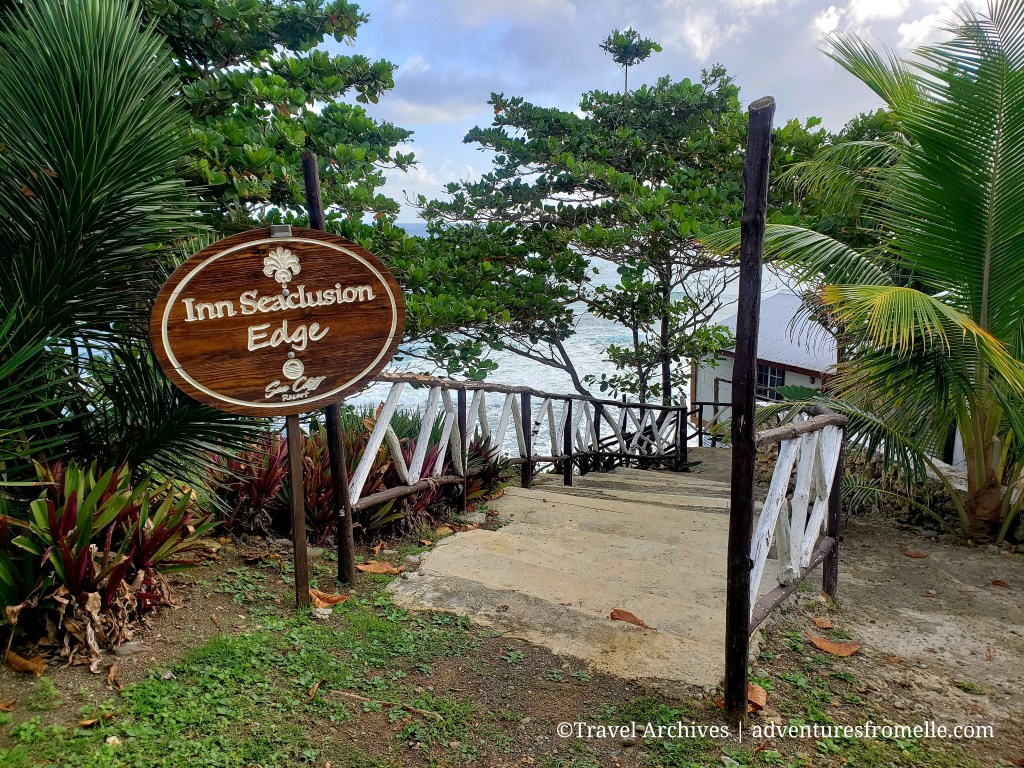 The property has a salt water mineral pool and swim-up bar which is almost complete. There are deck chairs scattered around the pool as well as some game tables for groups. I enjoyed the tasteful bits and pieces of art around the property, and the Inn Seaclusion Edge sign and staircase make for a delightful photo op. Breakfast is included in room rates, and we were treated to a traditional Jamaican breakfast of steamed cabbage or callaloo, ackee and saltfish and fried dumplings every morning. A continental breakfast of eggs and pancakes was also available, along with tea, coffee, fresh fruit and juice.