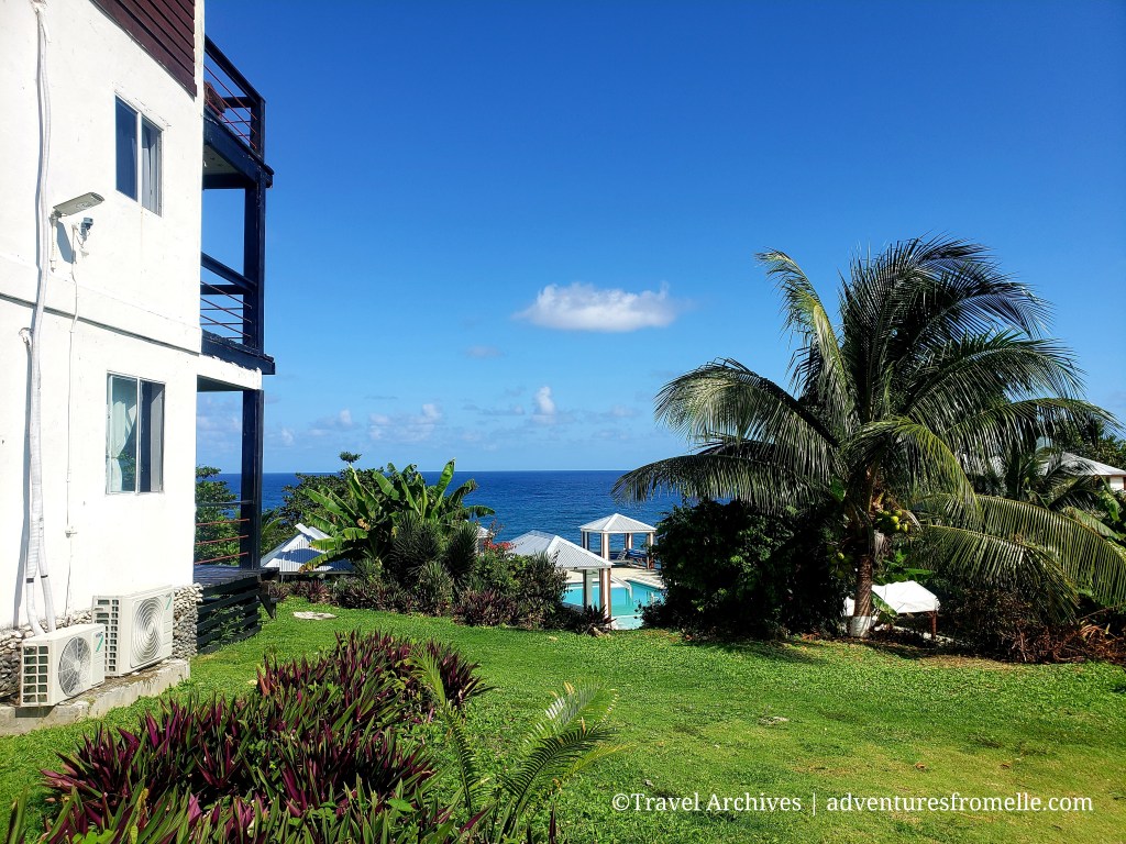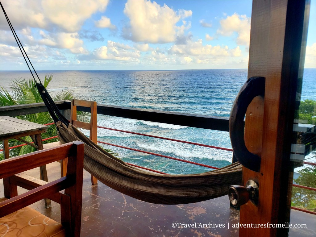 The showers are made from natural rock and consist of natural fixtures. Hot water from solar heaters is available, and fresh linen is provided at regular intervals. The balcony was my favourite part of the suite. The hotel was smartly built to afford each room an unbroken 180° view of the Long Bay cliffs. The sunrises and sunsets from the balcony were glorious. I could sit and watch that view of waves breaking at the reef then crashing by the cliffs forever. The Long Bay cliffs were equally as stunning as the view of Cousins Cove from the Poet Reef Villa.