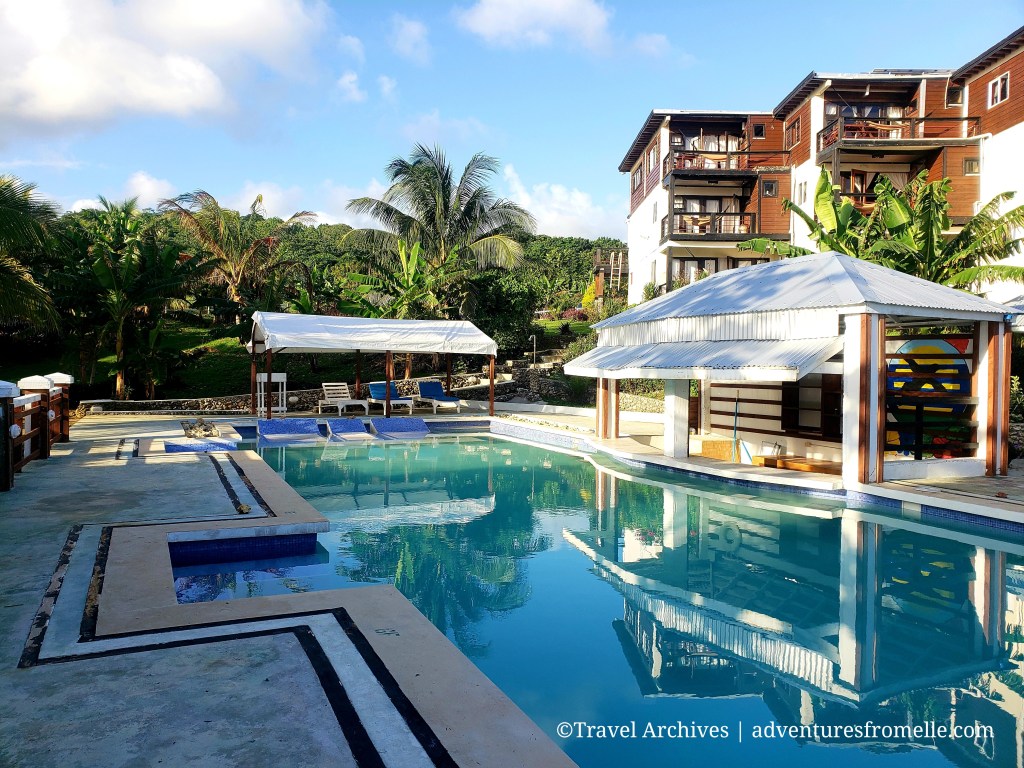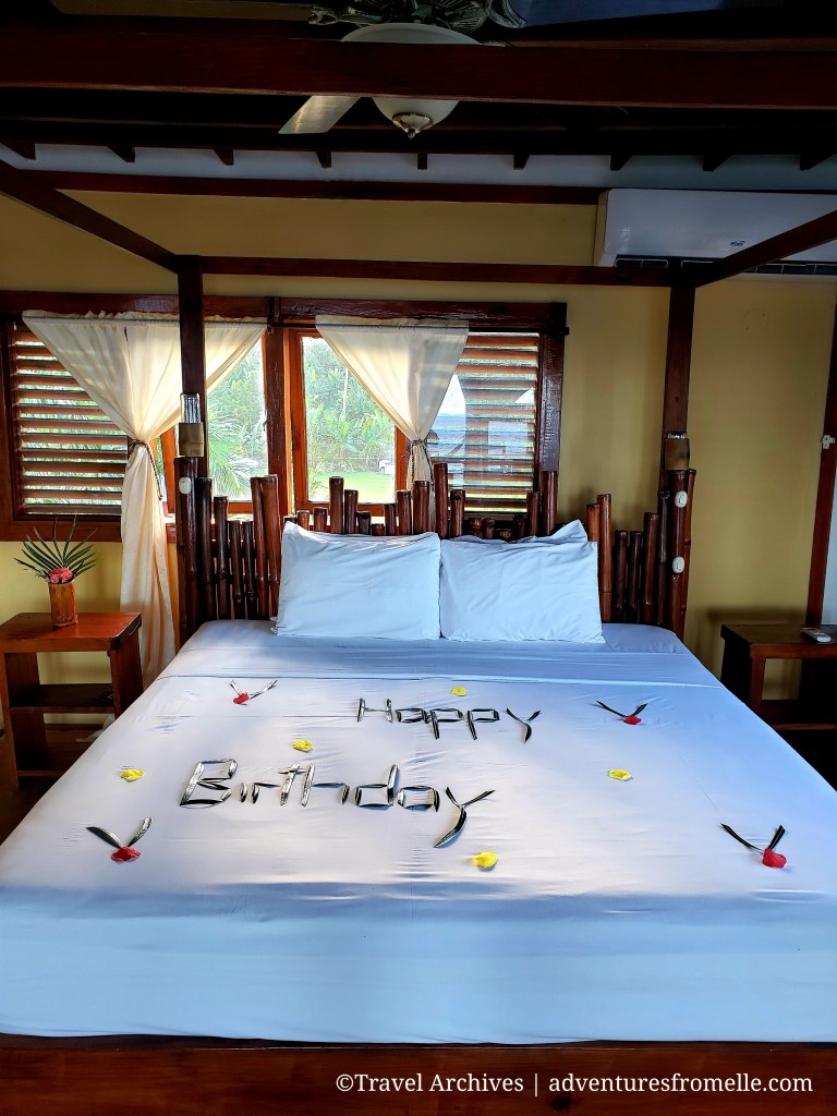 Before reaching my room (#8), I was impressed with the quaint rustic feel of the hotel. The structure of the main building has been standing for at least two decades, and the constant salty spray from the Caribbean Sea can age a building ahead of its time. However, the hotel is well maintained and the occasional creak or rusted nail only added to the hotel’s charm. I admired the cozy tropical style of the flooring, wooden ceiling, windows and bamboo frame four poster bed. In fact, they even decorated the bed with “Happy Birthday”. That thoughtful gesture really set the tone of my (our) vacation, and I was surprised they even knew we were celebrating a birthday. I guess I had mentioned it on the phone while making the reservation.