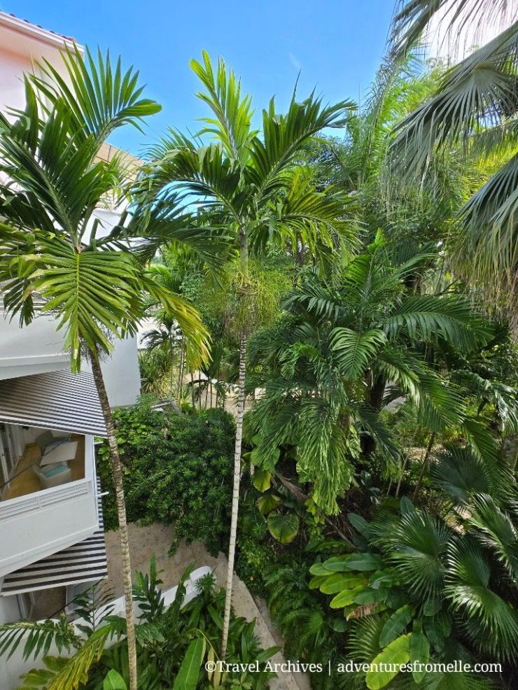 Our deluxe garden view room was cozy and chic with bright Caribbean blues, coir mats, a plush king sized bed, locally made wooden furniture, a well-stocked mini fridge, coffee pot, safety deposit box and en-suite bathroom. Just outside my balcony was this beautiful palmetum pictured above with at least six palm species. Room service, daily housekeeping and nightly turndown service were all included.